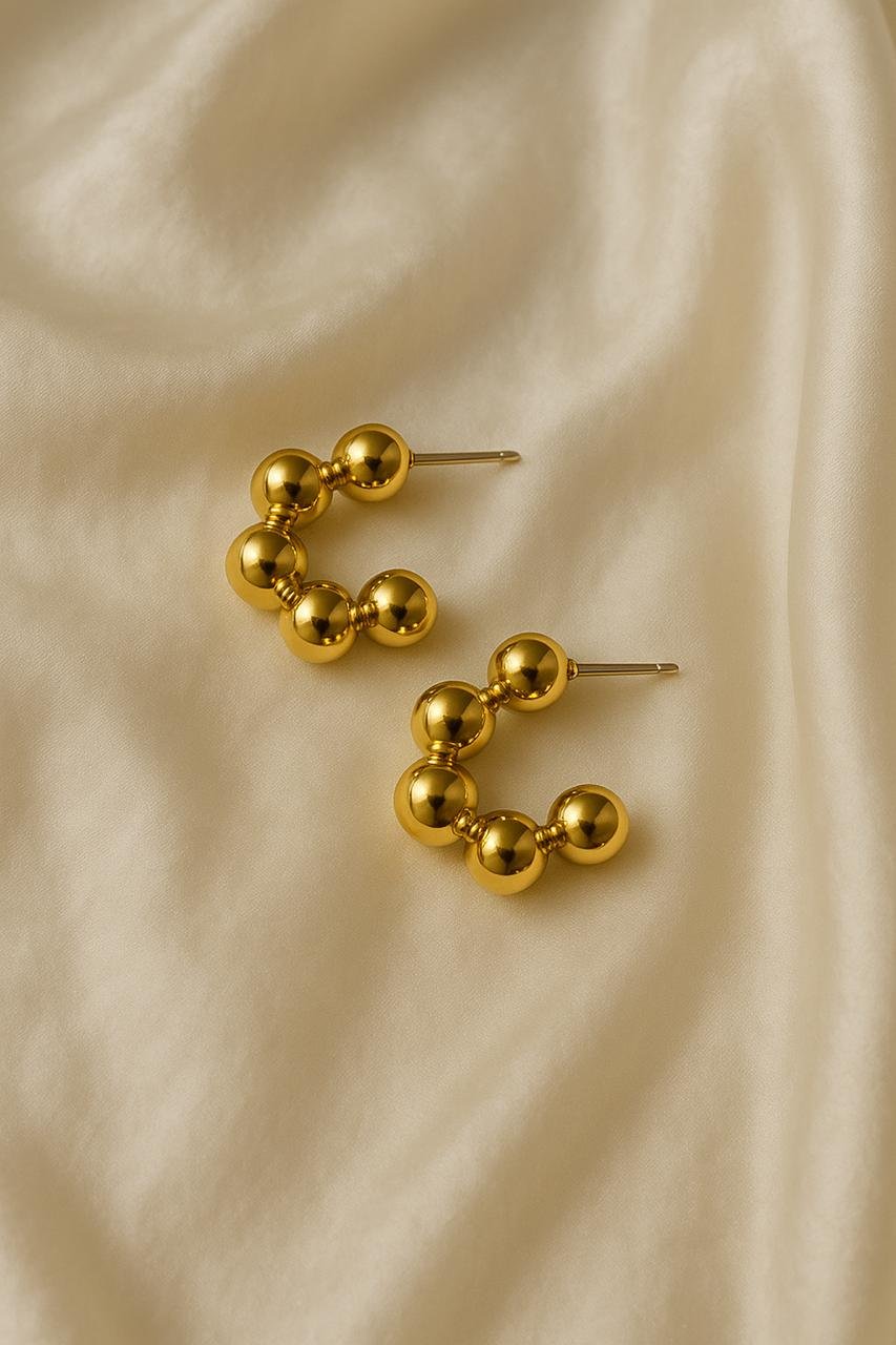 These earrings are a chic and contemporary pair of beaded hoop earrings, crafted with a playful and sculptural design. Formed by a series of glossy, gold-toned spherical beads, the earrings curve into an open C-shape, giving them the look of modern mini hoops with added volume and texture. Each bead is seamlessly connected, creating a smooth and polished surface that reflects light beautifully.