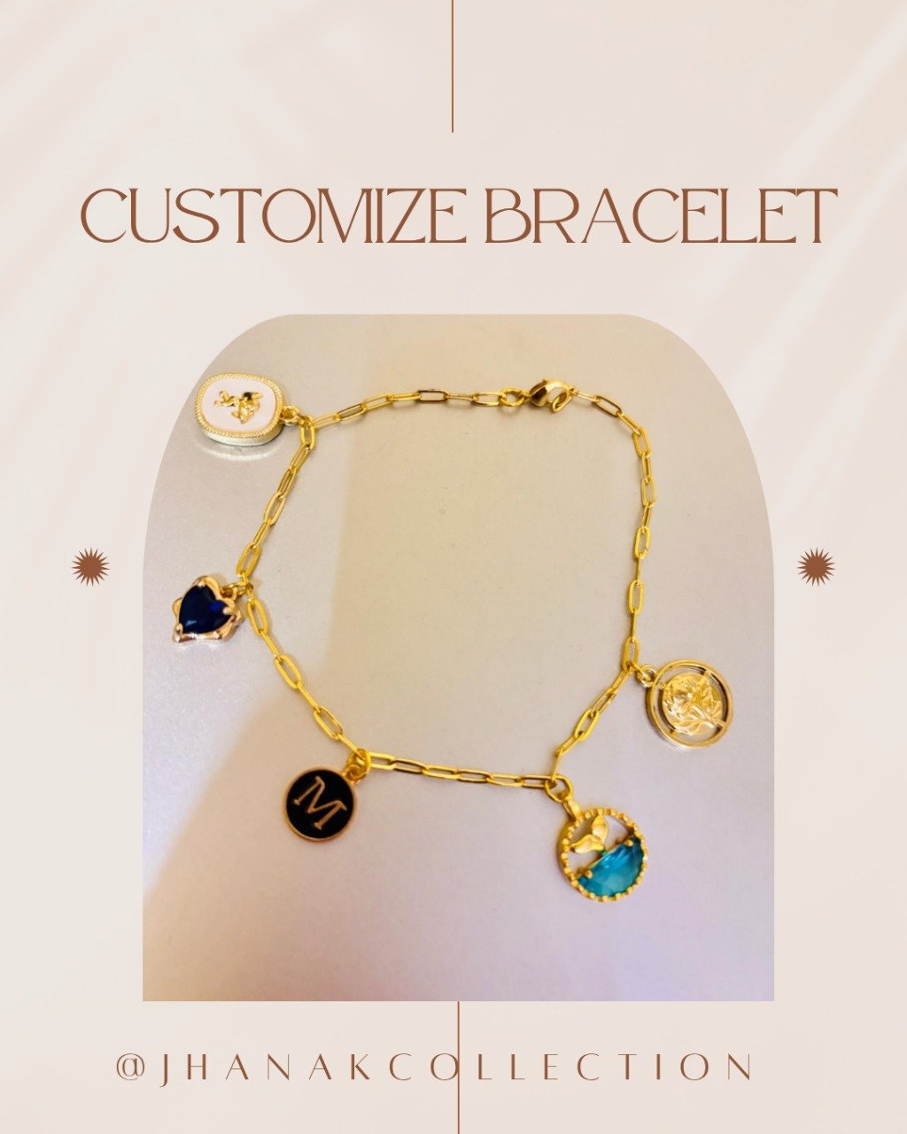 This customizable charm bracelet is a perfect blend of elegance and personal expression. Crafted with a sleek gold-toned chain, it features a series of unique charms — from initials to heart and artistic motifs — each designed to reflect your individuality.