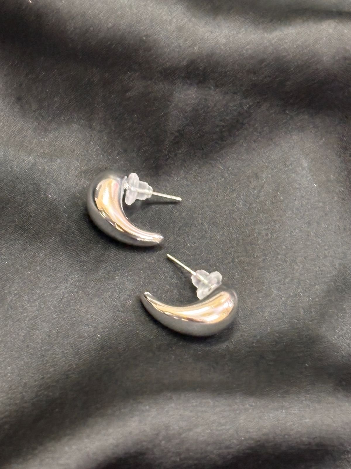 These earrings feature a sleek and modern crescent-shaped design in polished silver metal. With a smooth, reflective finish and a minimalist style, they exude contemporary elegance. The stud-style earrings are secured with transparent silicone backings, making them comfortable for daily or casual wear while still adding a chic and stylish touch.
